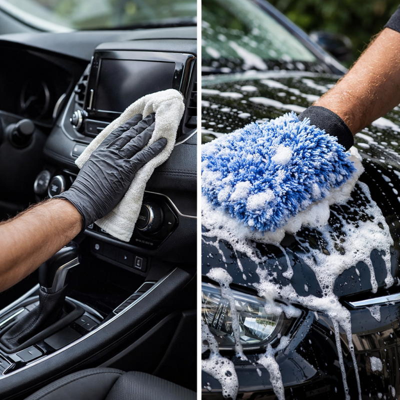Een grondige handwas om vuil en stof te verwijderen, gevolgd door de auto te drogen en de banden een frisse look te geven. Perfect voor een snelle opfrisbeurt.